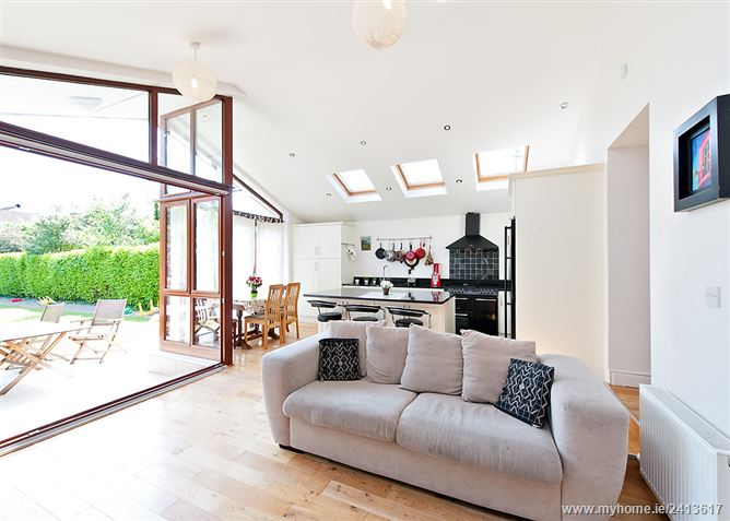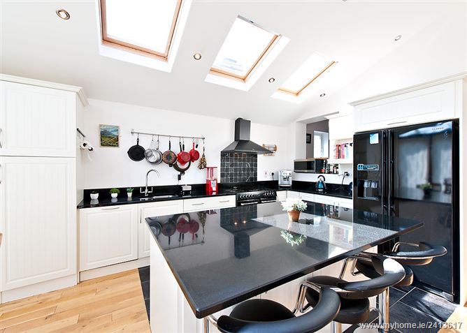 Terrific family room with an abundance of natural light. Extensive range of modern fitted presses, kitchen island with lots of storage presses, modern equipment – Bellilng range with double gas hob, electric oven & grill, American style fridge, washing machine, Family area contains lots of built-in shelving units and t.v. point.